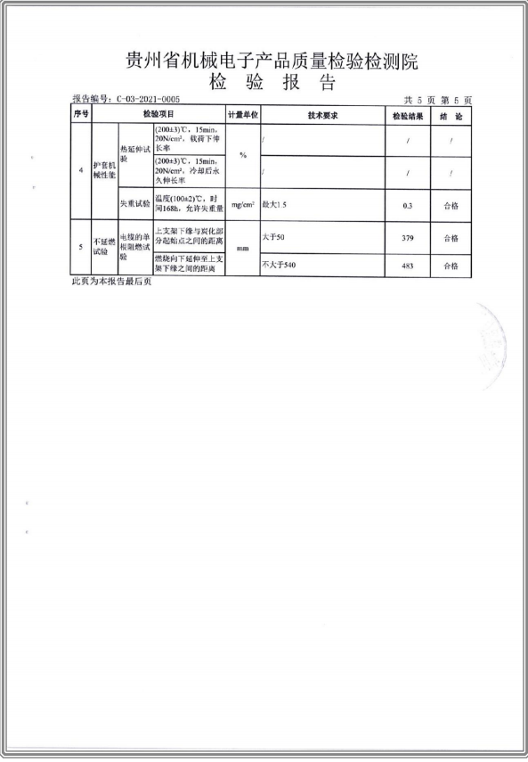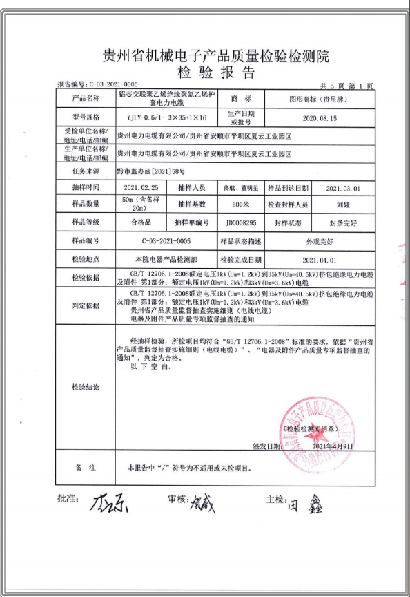 鋁芯交聯(lián)聚乙烯絕緣聚氯乙烯護(hù)套電力電纜 檢驗(yàn)報(bào)告